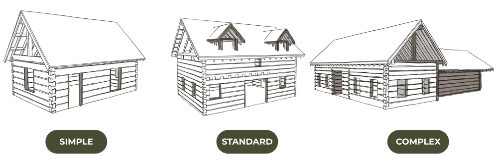 Complex: Expanded layout. Many corners. Extensive dovetail cutting and log fitting.